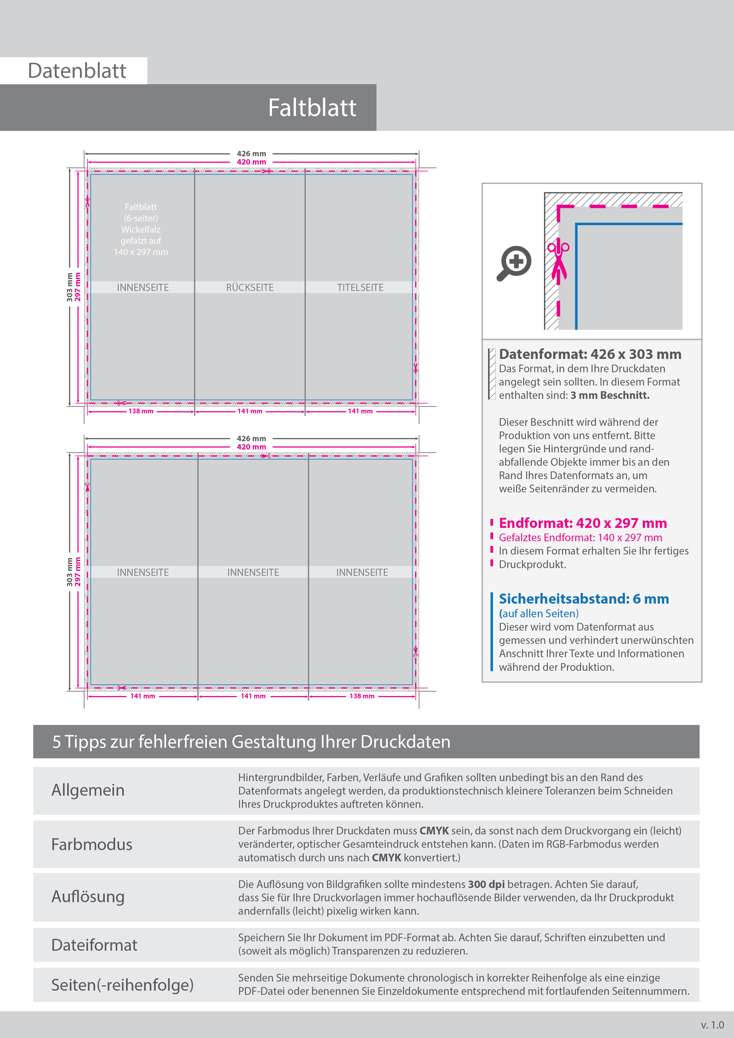 Faltblatt, gefalzt auf 14,0 cm x 29,7 cm, vertikaler Wickelfalz, 6-seitig